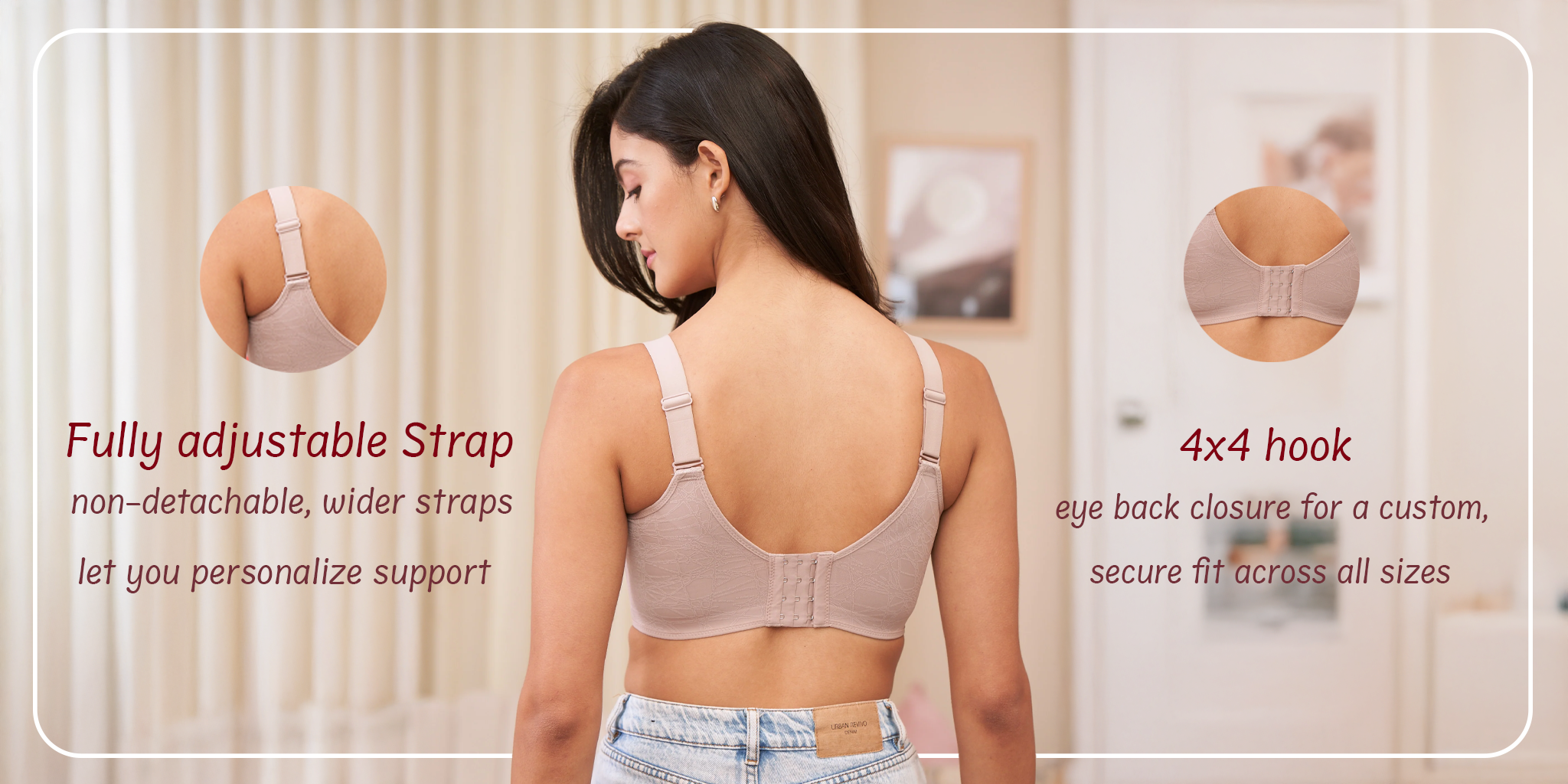 4x4 hook & eye back closure for a custom, secure fit across all sizes. -